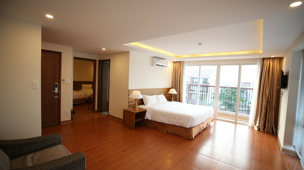 Family Room numeriai: du kambariai, vienas privatus vonios kambarys, svetainė, terasa / balkonas, daugiausia 4 svečiai.